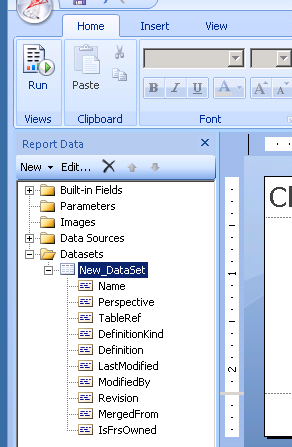 2.Expand Data Source on the left side. (If you do not see the Report Data panel on the left side of the screen, select View > Report Data to display the panel.)