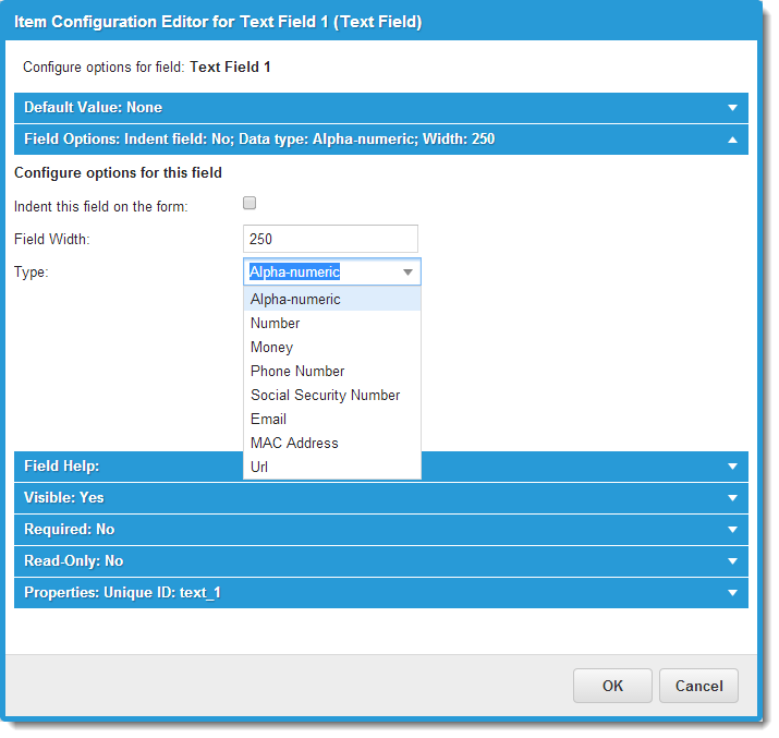 1.Within the Item Configuration Editor of a date, time, DateTime, text, money, or mask field, expand the Field Options area.