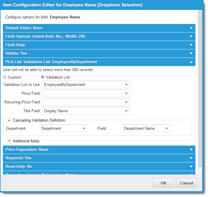 | Validation List to Use | Choose Employees or EmployeeByDepartment from the drop-down list. |