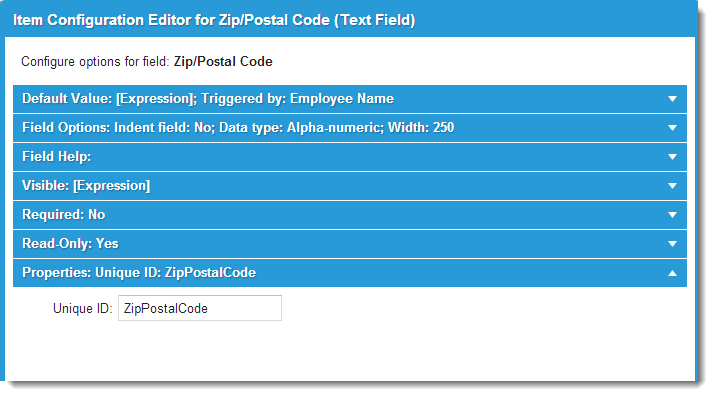 To specify a unique ID for a control to be referenced programmatically within the Item Configuration Editor, expand the Properties area and enter a unique ID in the Unique ID field. Click OK.