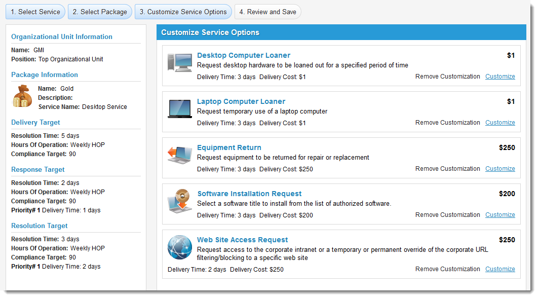 Review the Service Level Package. To modify any part of the package, click change next to an option and edit it.