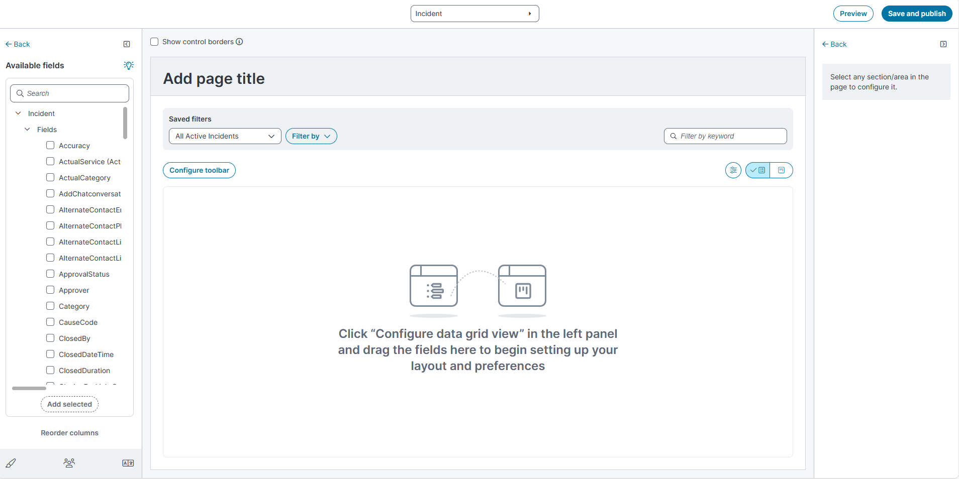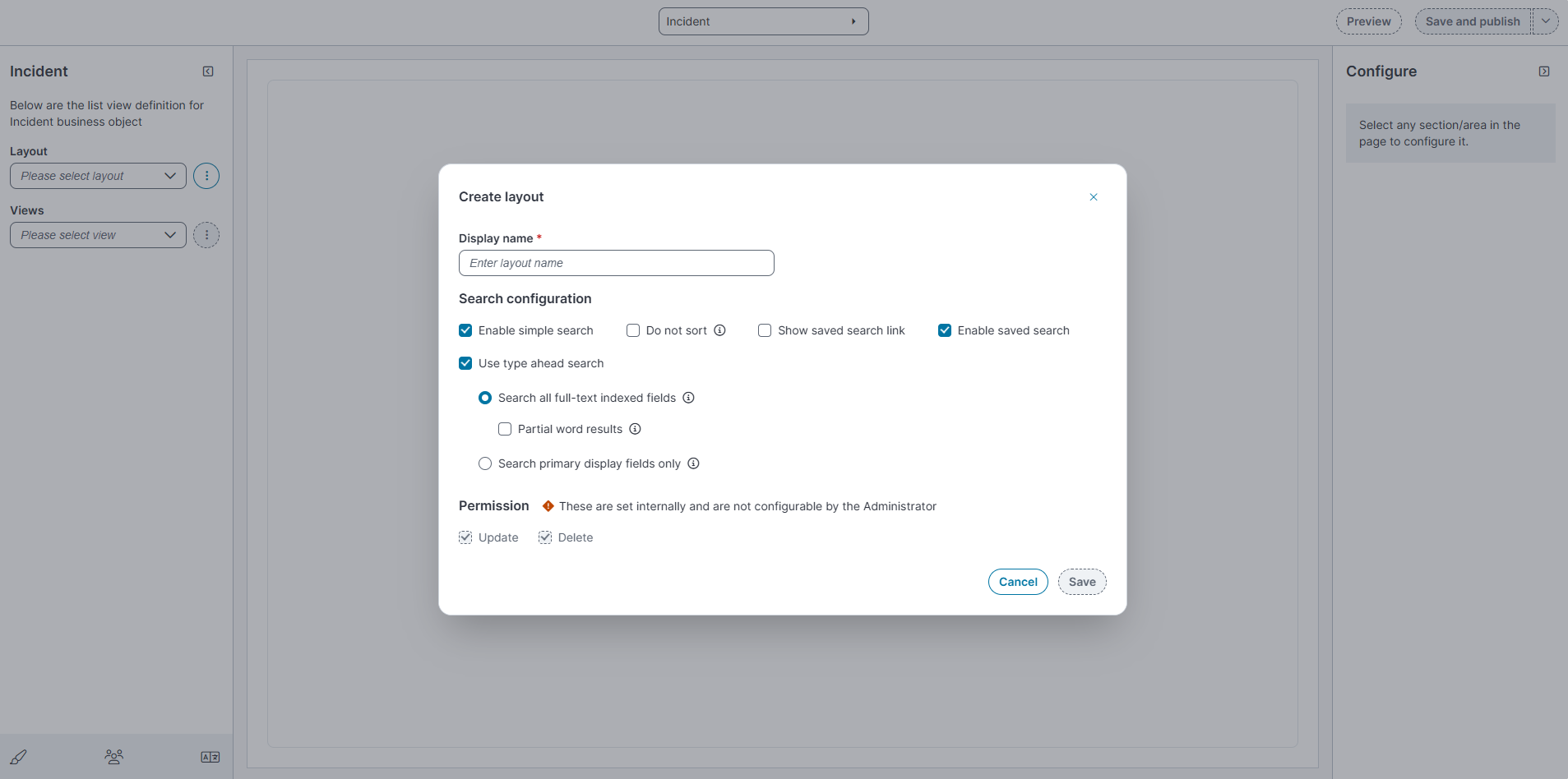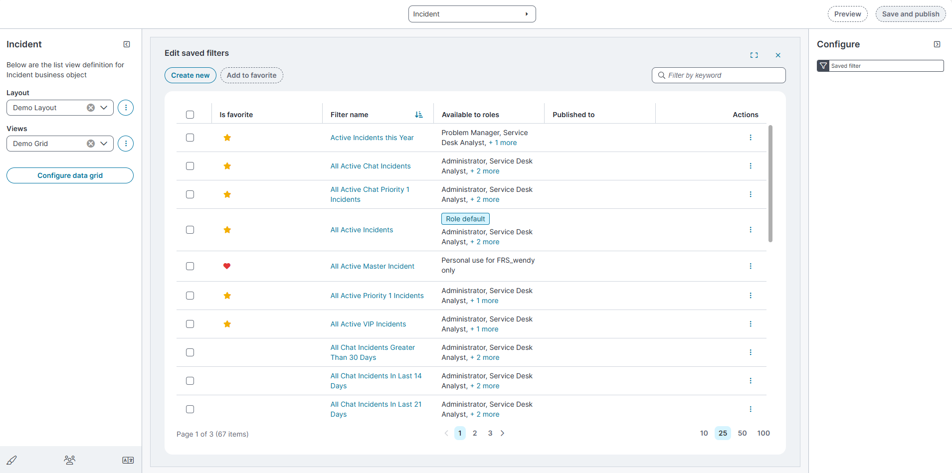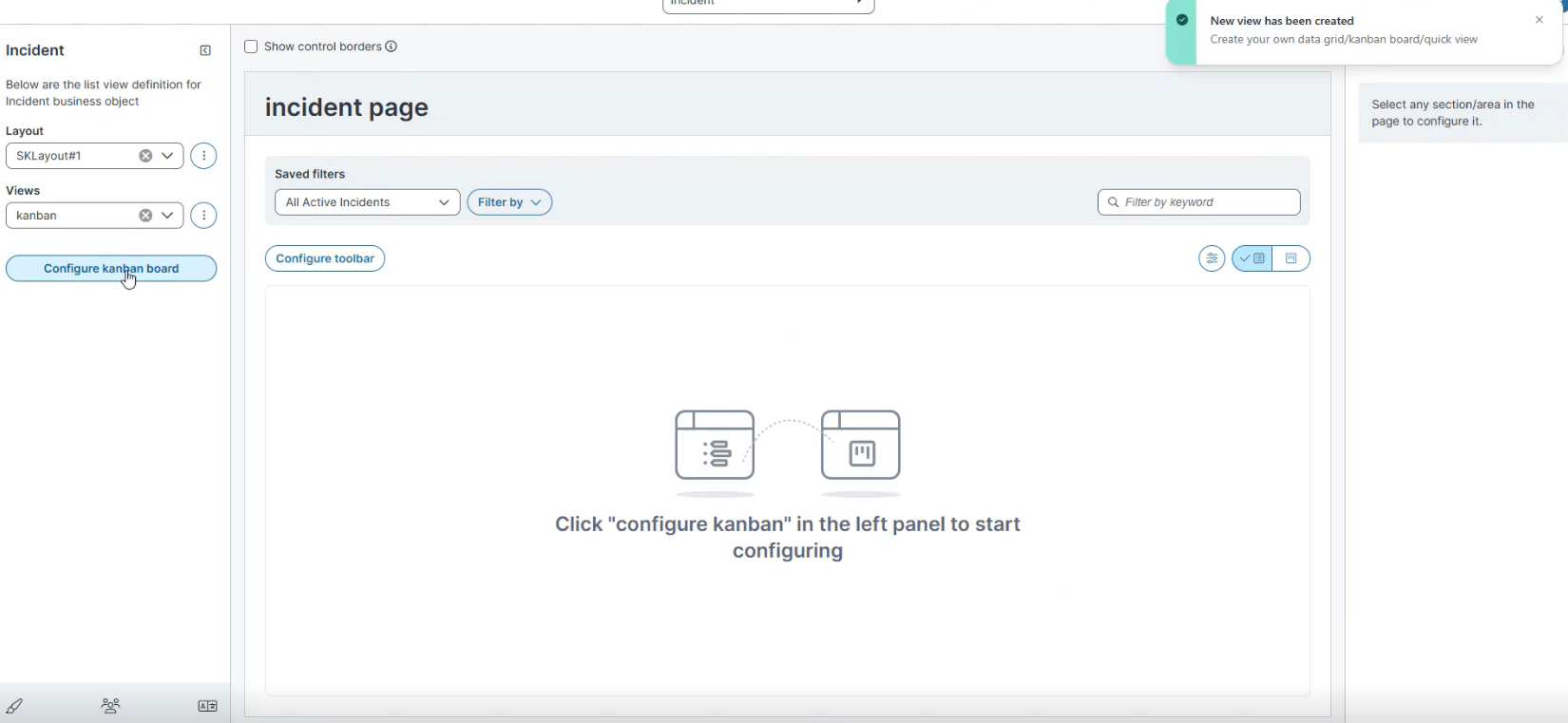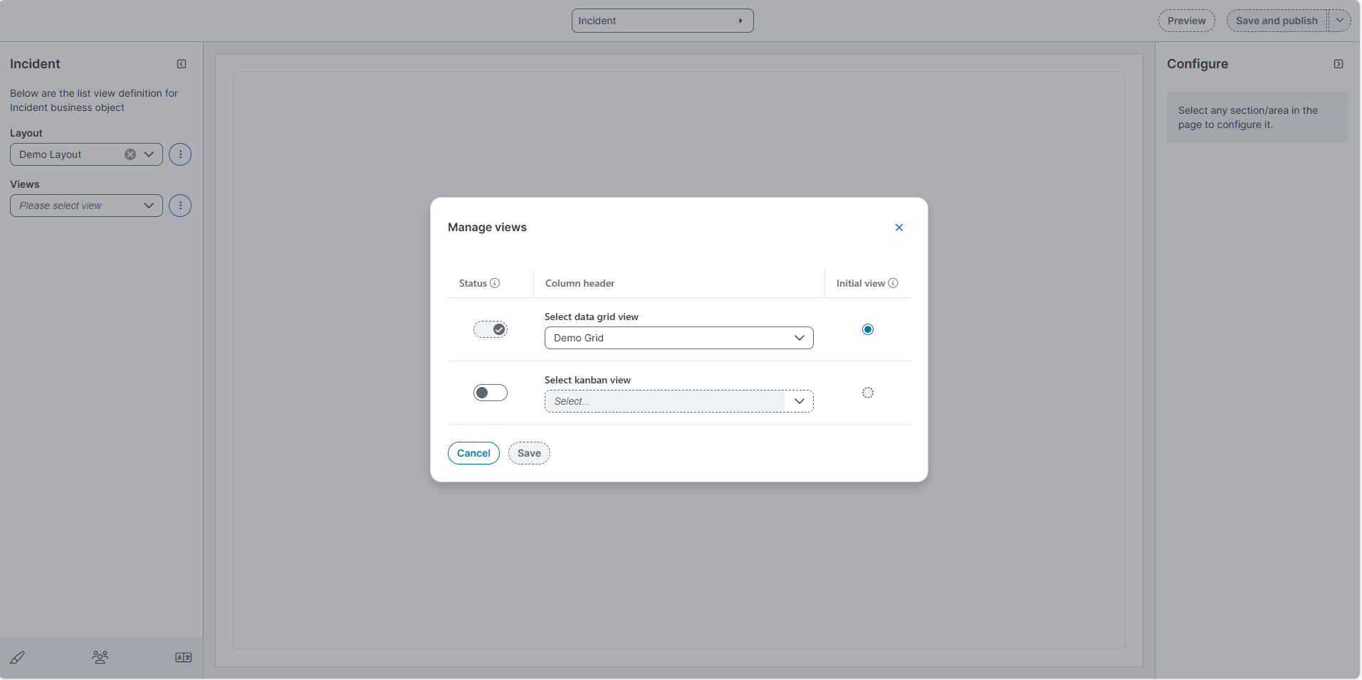You can use the Modern Page Designer to create and assign role-based layouts for any business object. In this procedure, we use the Incident business object as an example use case. You will configure a layout, add a view (Data grid, Kanban or Gallery View), and publish a data grid layout.