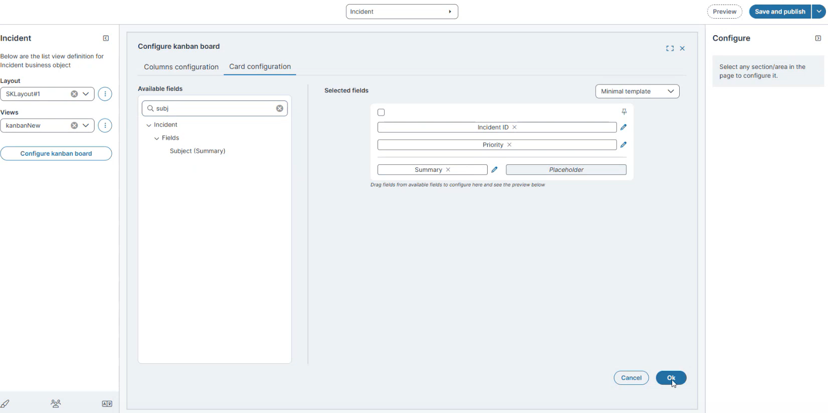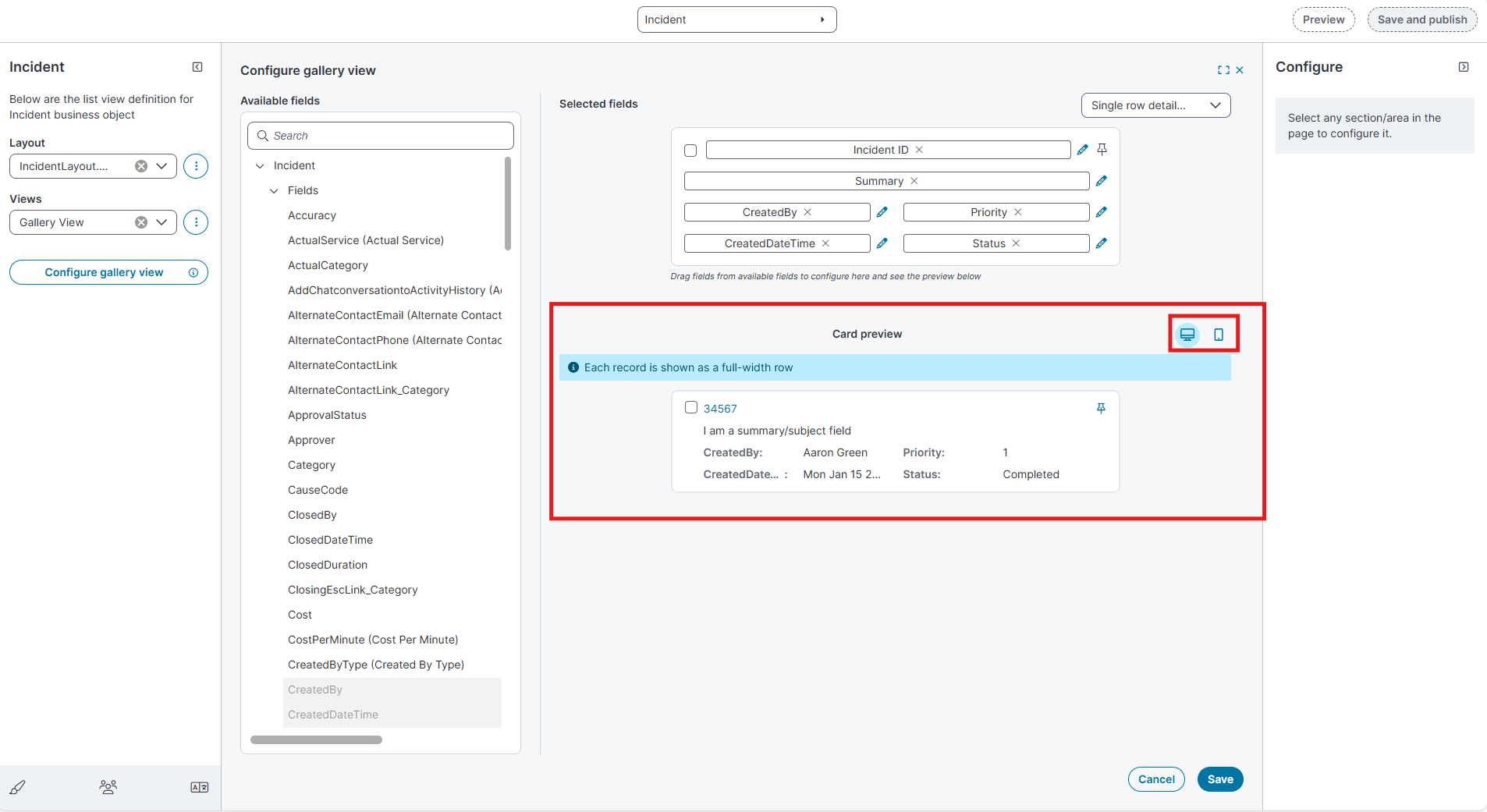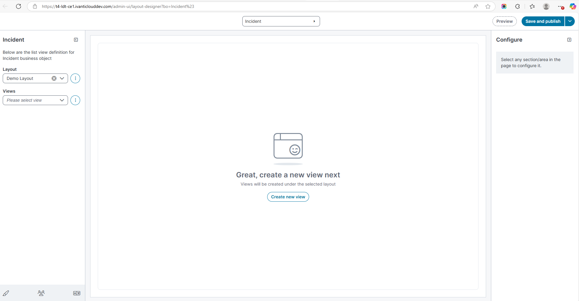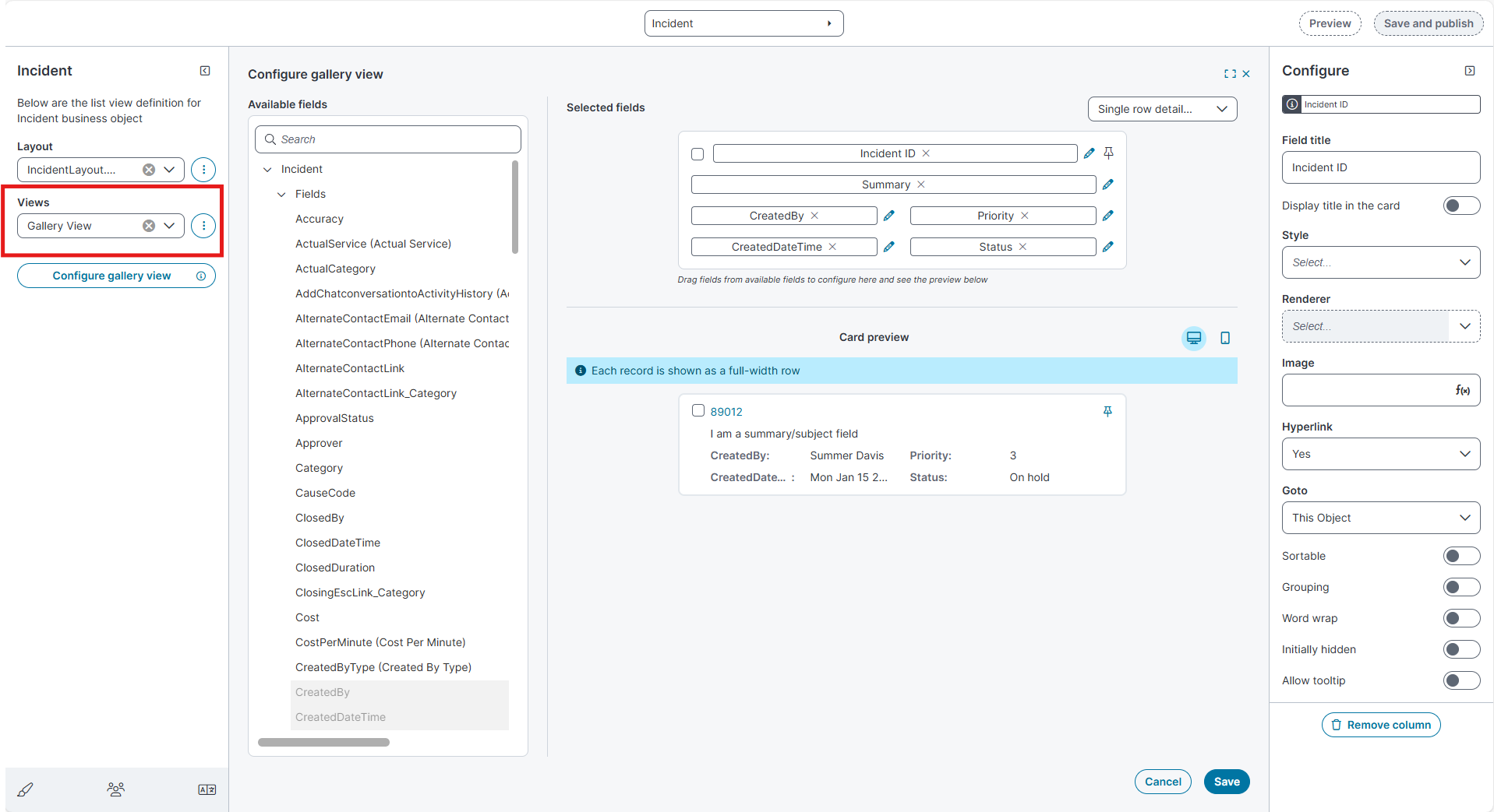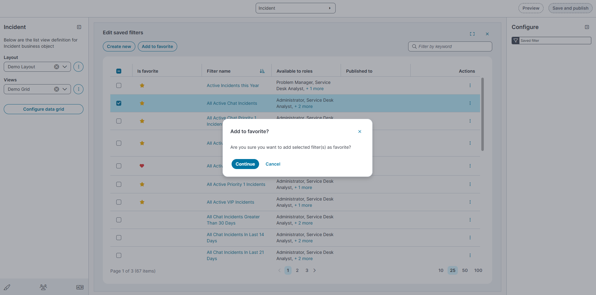 You can use the Modern Page Designer to create and assign role-based layouts for any business object. In this procedure, we use the Incident business object as an example use case. You will configure a layout, add a view (Data grid, Kanban or Gallery View), and publish a data grid layout.