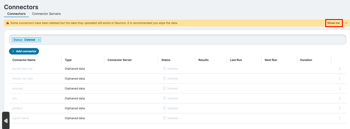 If your Ivanti Neurons database contains orphaned records, a yellow banner will display on the Connectors page alerting you to those records. You can click Show me to filter the results down to just those orphaned records. You can then delete that data from the system by clicking the options menu in each row and selecting Wipe Data.