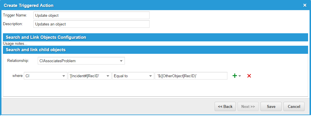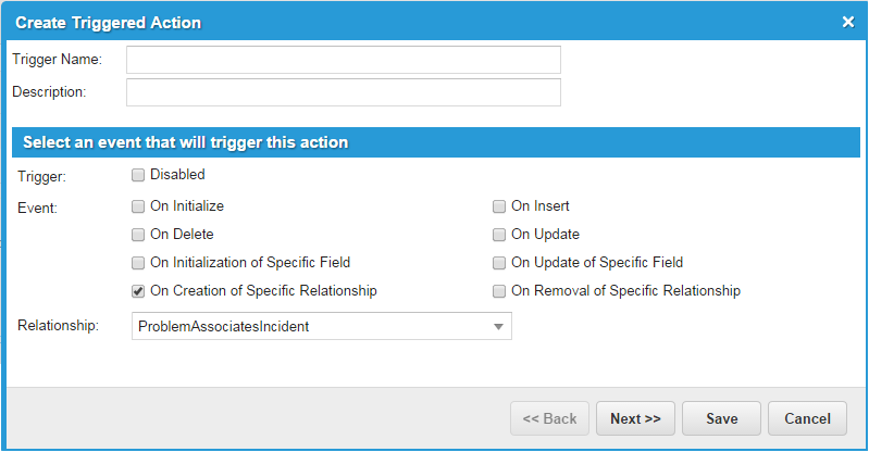 Create Triggered Action Window - ProblemAssociatesIncident