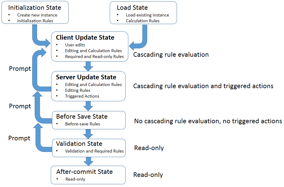 When clients (such as the user interface, workforce engine, email listener, and so on) enter data about the business object instance. This is when the editing and calculation rules are executed to update the values. When you save, the required and read-only rules are executed on the client.