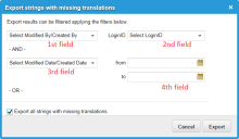 In the Export Since column of the Languages workspace, click Export next to the target language to export. The application displays the Export strings with missing translations dialog box.