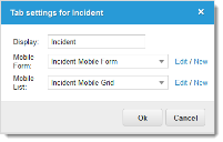 The tab settings for the <relationship name> window appear when you drag and drop a relationship object. Select a mobile form and mobile list for the object. If the menu is empty, you need to create a new layout for this object. Click New to create a new layout or click Edit to edit an existing layout, if one exists.