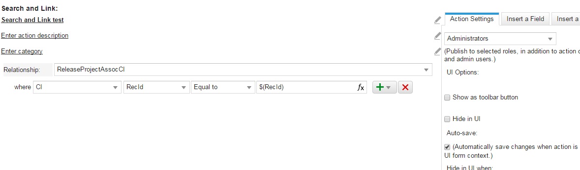 You can use the Search and Link action to perform an action on a child business object of another child business object that is associated to a business object. For example, you might want to search for all configuration items associated to a change that is associated to a release in order to directly link all the configuration items from the change to the release.
