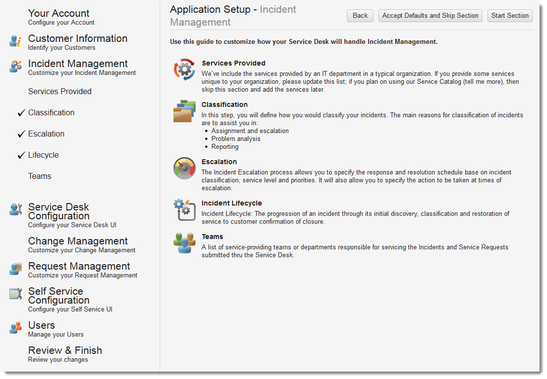 Use the Application Setup - Incident Management page to define how your Service Desk will manage incidents.