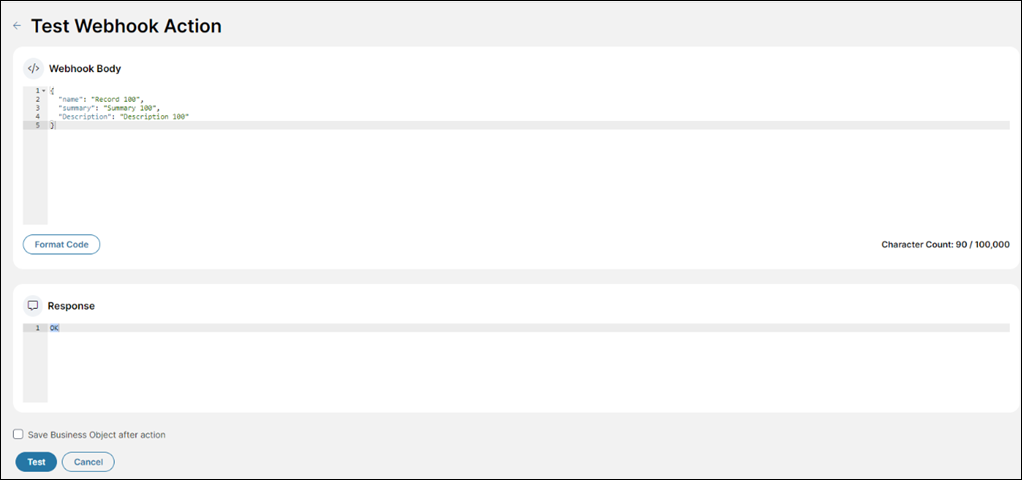 3.Paste valid JSON or XML that you expect to be sent from the external tool to the webhook endpoint into the Webhook Body.