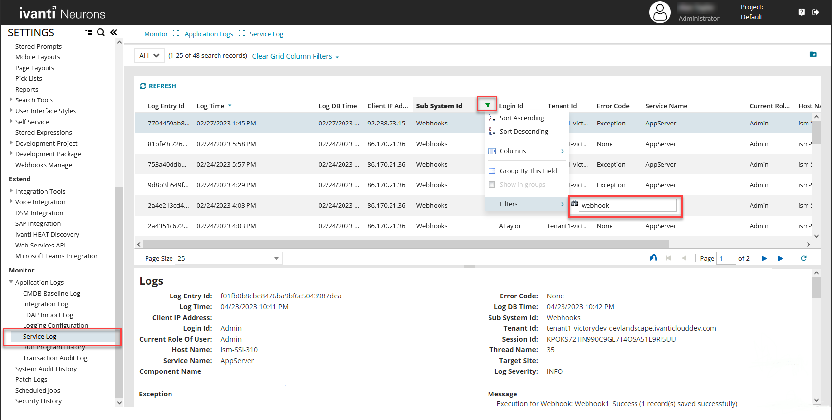 for the SubSystem Id and then enter Webhook in the Filters box.