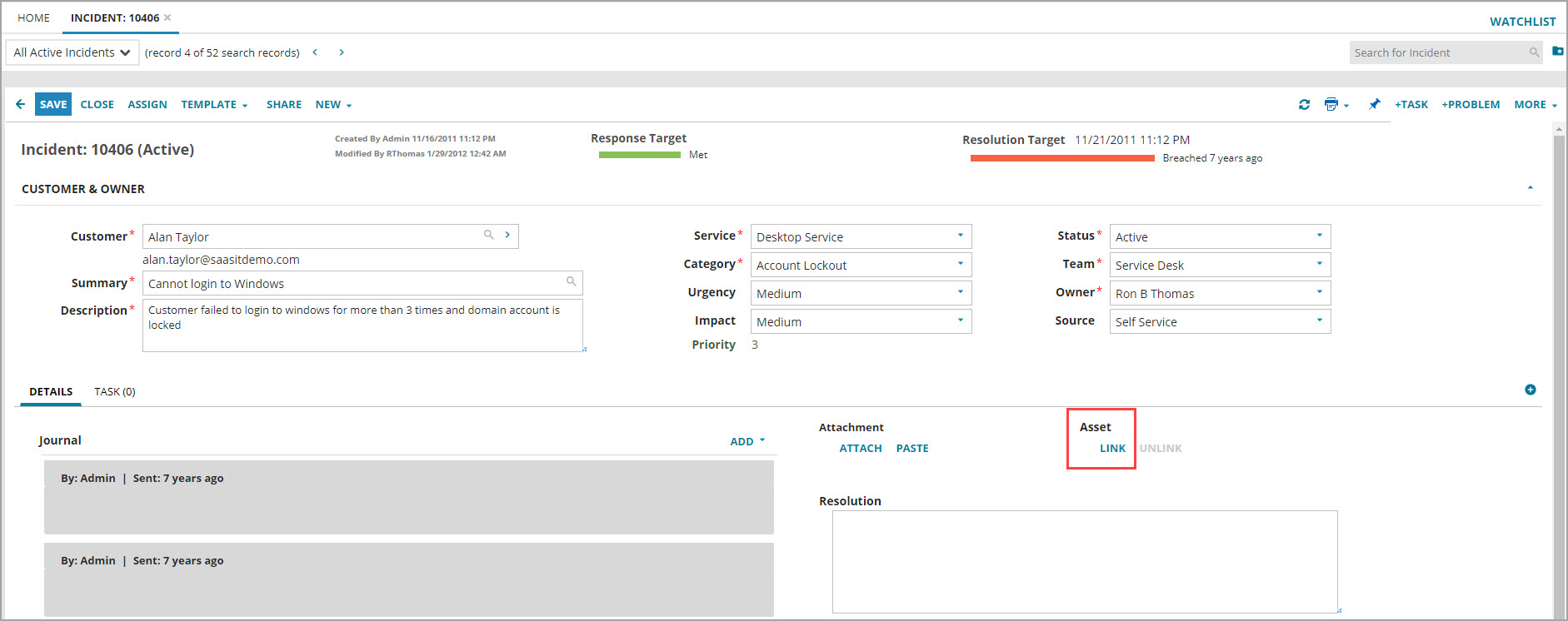 7.Click Save. The application updates the fields in the linked incidents with the values that you entered for the master incident. For the linked incidents, it also adds the text ***Resolved through master incident number*** in the Resolution field on the Resolution Details tab.