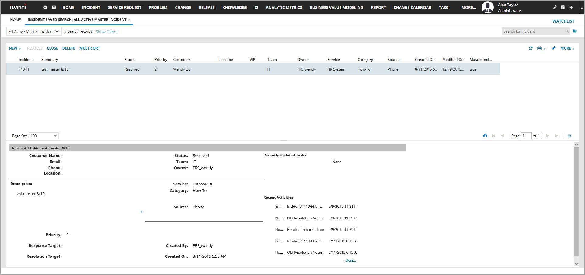 6.To see the incidents linked to the master incident, click the Related Incidents tab. All incidents that are linked to the master incident are listed.