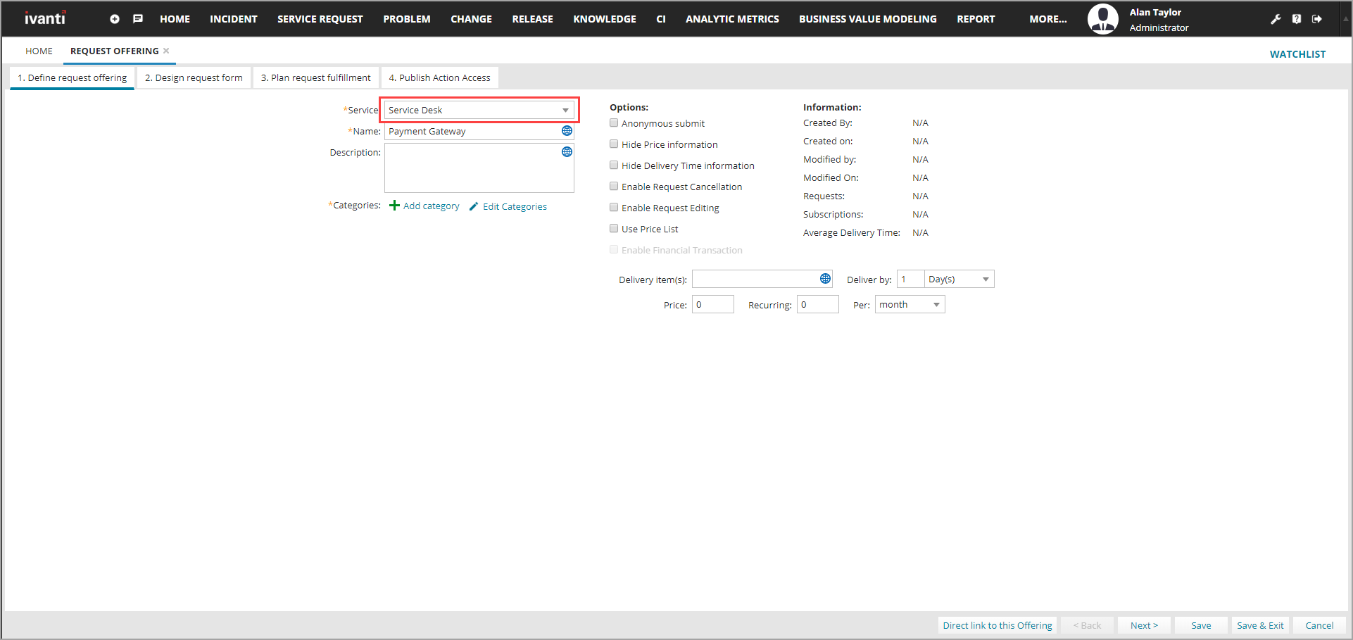 Before creating a Service Level Agreement, you must create your Request Offerings and any optional Service Level Packages. Neurons for ITSM includes various basic services that you can use or modify to fit your organization.