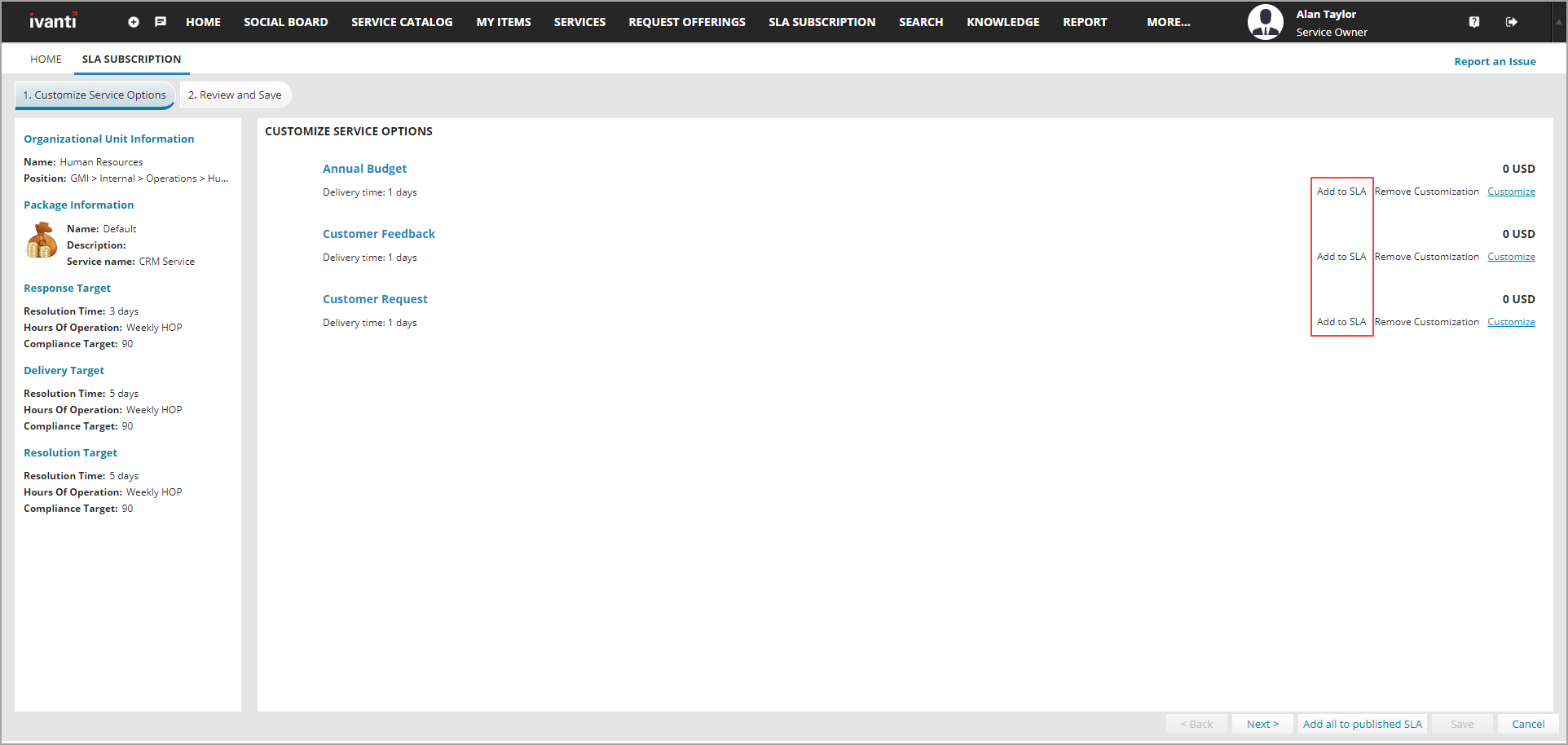 The Add to SLA text is also visible for Request Offering when a new agreement is created.