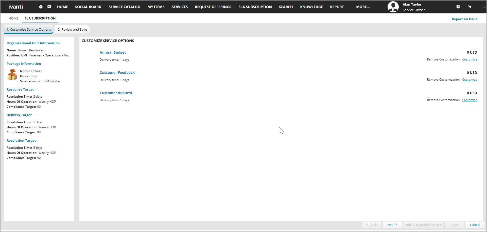 Review the Service Level Package. To modify any part of the package, click change next to an option and edit it.
