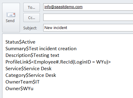Based on the mailbox created above, "Summary$Test incident creation"' means that the text "Test incident creation" is stored in the Summary field. The $ symbol is the field delimiter.