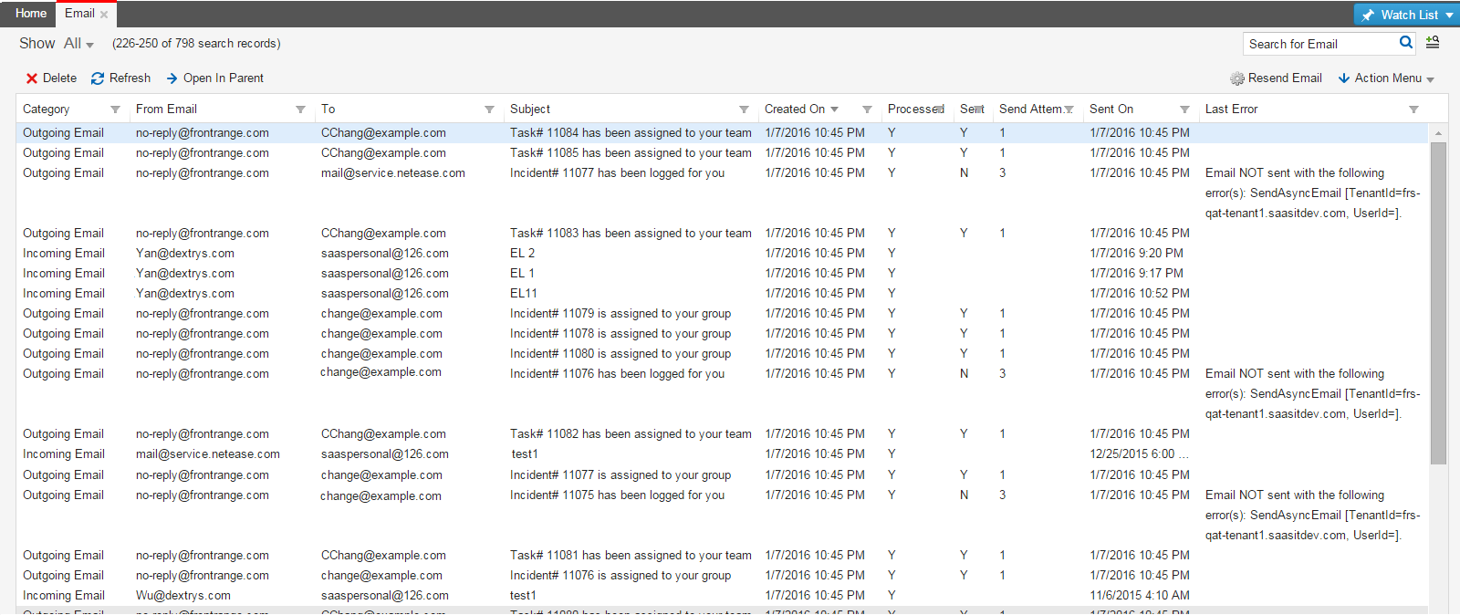 •The Processed status for emails is set to Y or N. Refer to About Processing Incoming Emails for information about processing emails.