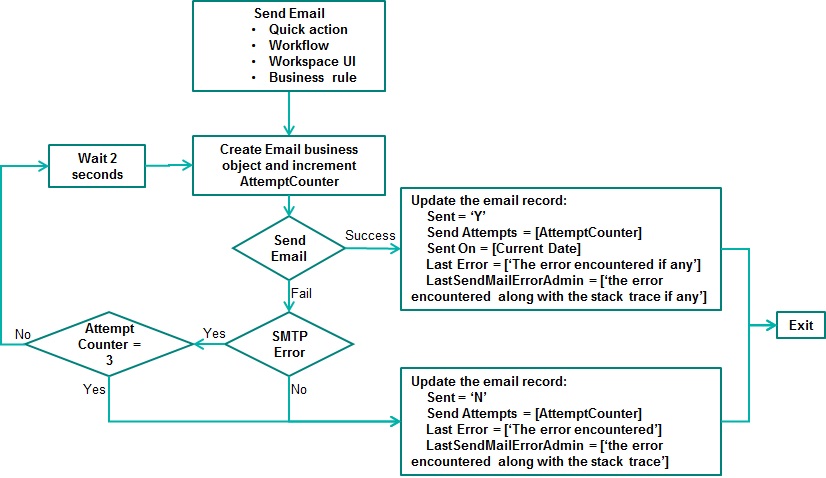 To ensure that outgoing emails reach their recipients during application exceptions, email processing includes the following:
