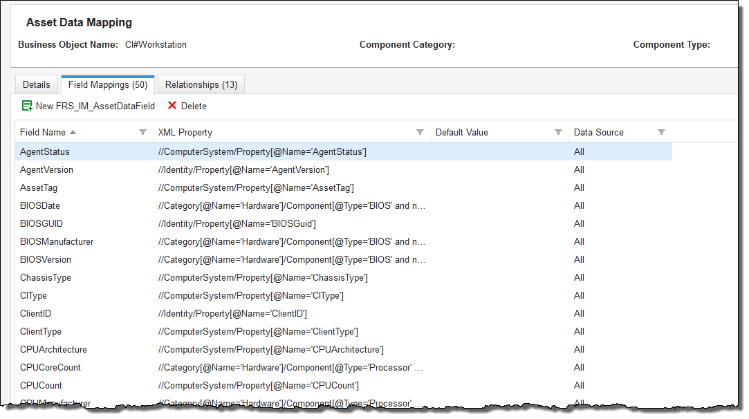 3.Double-click the configuration item business object to which to map the SCCM field, such as CI.Workstation. The Asset Data Mapping page appears.