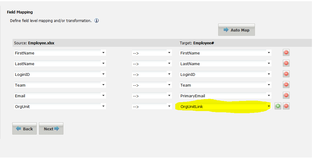 9.Click Next. The application displays the Field Mapping screen.