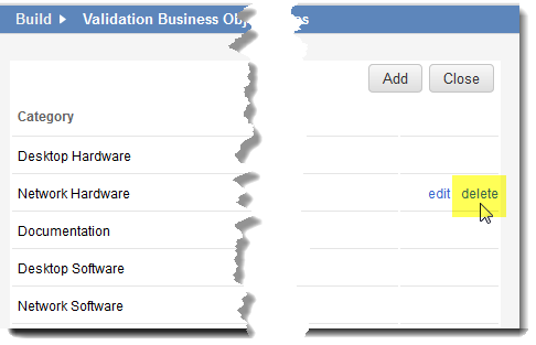 next to the validation business object to delete. The application displays the Delete dialog box.