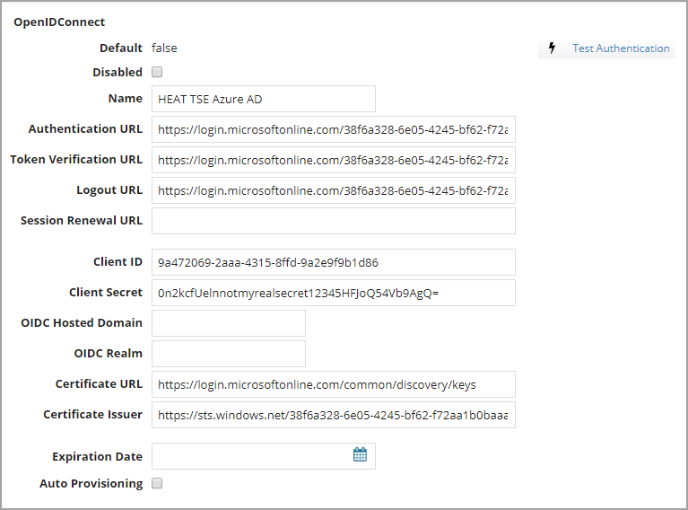 6.To verify the authentication, click Test Authentication. (note you must have an Employee record with an appropriate External Auth linking it to this provider before the test will be fully successful).