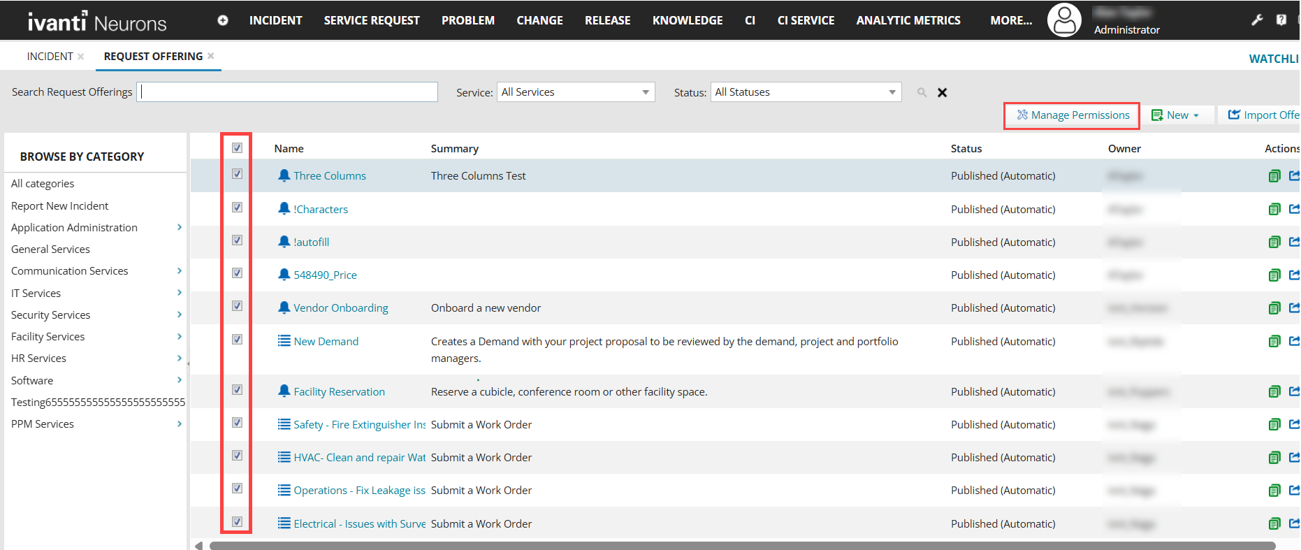 1.In the Request Offerings workspace, select the checkbox next to required request offering you want to update.