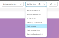 •Enterprise Landing Page - Displays all roles as tiles, based on the roles selected in the Exceptions / Custom Roles section of the Style Editor. To view options or menu available for a self service role, select the Self Service dropdown list, or click on the Self Service tile.
