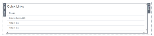 Field Description Name The name displayed on the Quick Links box tab - shown in the Page Designer only. Widget Title A title for the Quick Links widget. The title is shown on the published page (default name is Quick Links). Layout options Select a layout option from the dropdown list - List, Tile, Carousel, or Button Group Alignment Only displayed for the Tile layout. Select the link display alignment. Show Thumbnail This option is only displayed for the Tile, Carousel, and Button Group layouts. Using this you can display links as thumbnails. Enabling this option displays additional configurable options when configuring links in step 4 below. Number of items to display