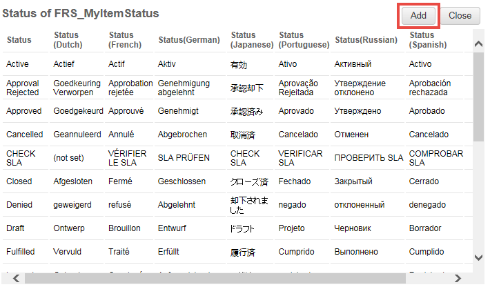 7.In the Status field, click Add, then add the new status such as waiting. To enter a localized value for the new status in any of the available locales, enter the value in the appropriate column.