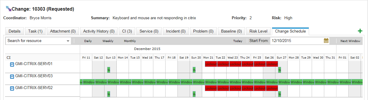 •If several configuration items are linked to a change request, you can enter the name or partial name of one of the configuration items in the Search for Resource field to view the schedule for that configuration item only.