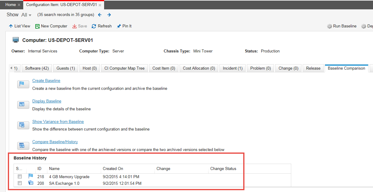 8.View the baseline history from the Baseline Comparison tab. The baseline history table shows the list of all the baselines for the configuration item at various times. The last successful baseline is the baseline, while the rest are historical data. Double-click any row to see details.