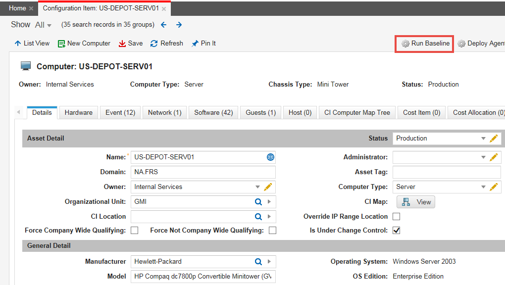 If the configuration item is related to a change, the baseline automatically runs when the change status is set to implemented. If necessary, the baseline can be run at any time by clicking the Run Baseline quick action from the Change workspace.