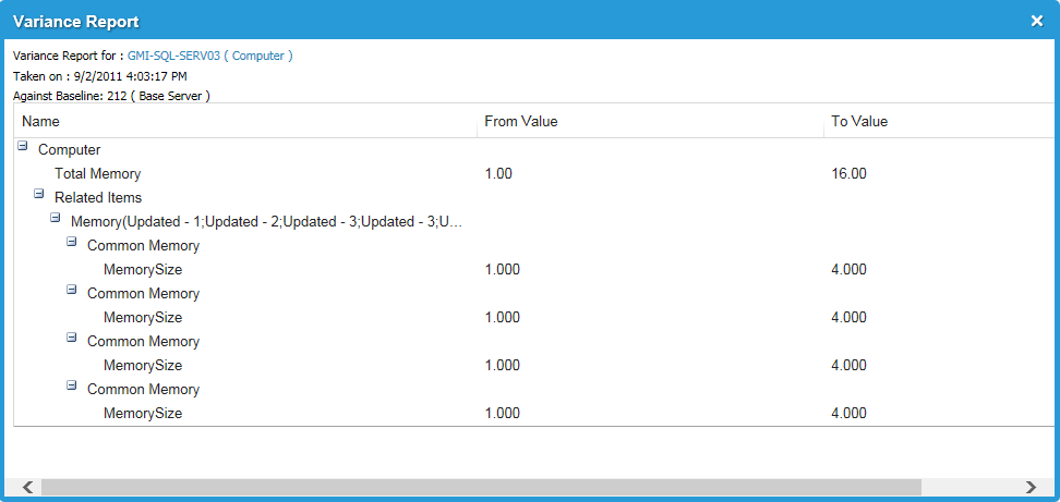 To view the changes, click the configuration item name link and view the attributes that have changed in the From Value and To Value columns.