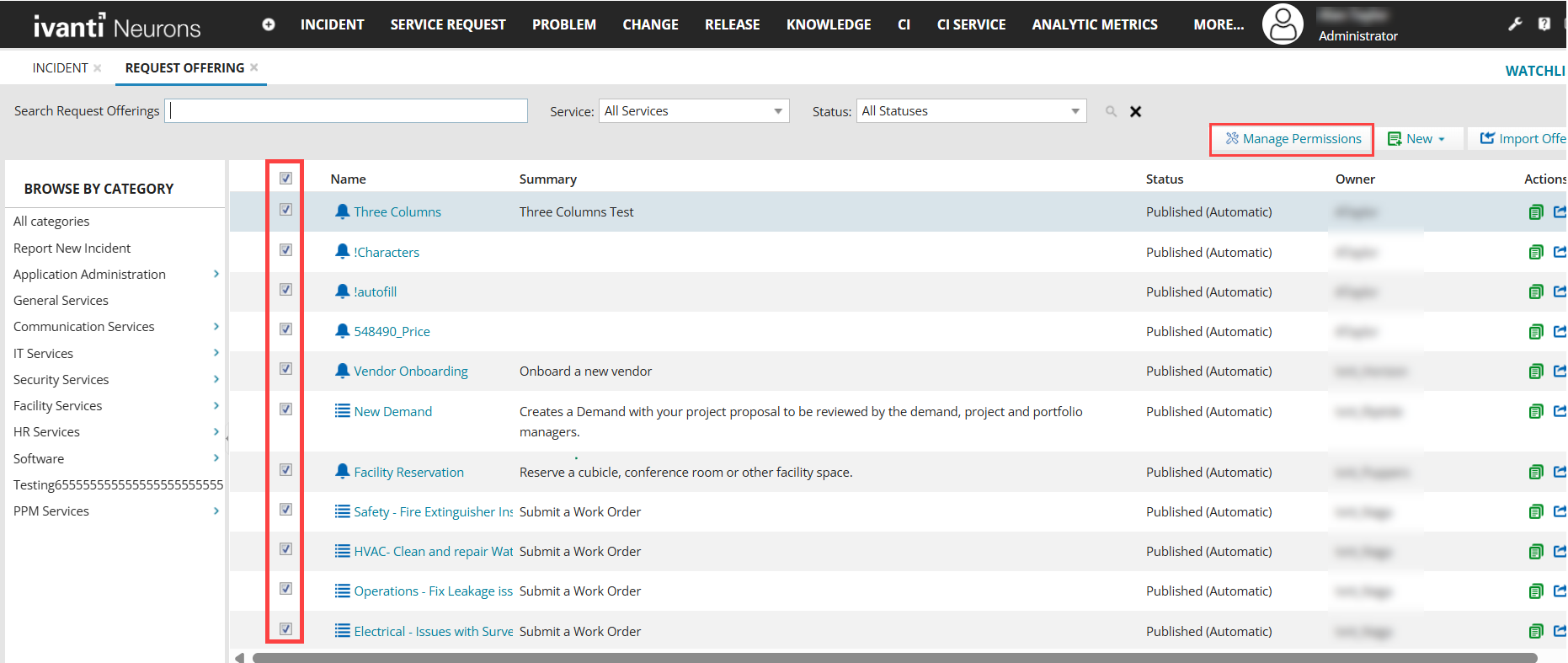 1.In the Request Offerings workspace, select the checkbox next to required request offering you want to update.