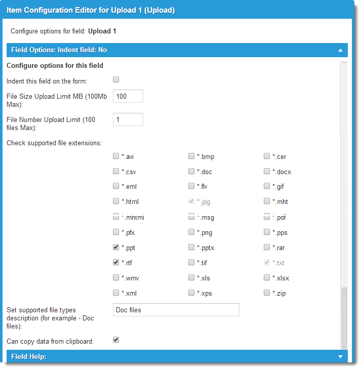 1.In the Item Configuration Editor of an Upload attachments control, expand the Field Options area.