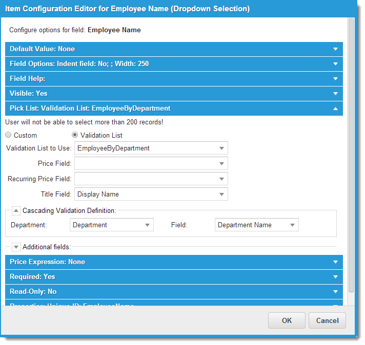 | Validation List to Use | Choose Employees or EmployeeByDepartment from the drop-down list. |