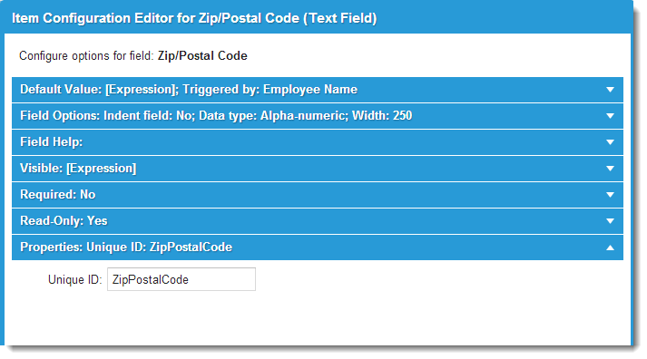 To specify a unique ID for a control to be referenced programmatically within the Item Configuration Editor, expand the Properties area and enter a unique ID in the Unique ID field. Click OK.