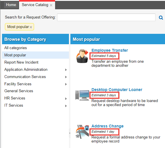 If configured, each item in the Service Catalog shows the estimated time it takes to deliver the request.