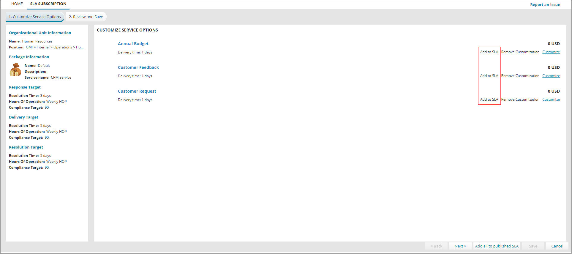 The Request Offerings created in step 3 are listed, with the text Add to SLA next to them, indicating that they need to be added to the selected SLA.