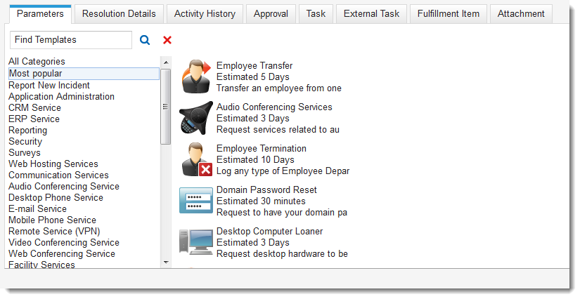 The Parameters tab shows customer information according to which service level agreements are valid. When you enter the customer name in the service request, Neurons for ITSM finds only those service offerings that are valid for that customer. These service level agreement parameters are managed by templates. Templates provide only those fields that are needed to comply with the service level agreement.