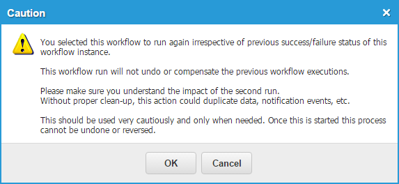 Make sure that you understand the impact of rerunning a workflow. When you rerun a workflow, you are rerunning it again irrespective of the previous success or failure status of the workflow instance. Rerunning the workflow does not undo the previous workflow execution.