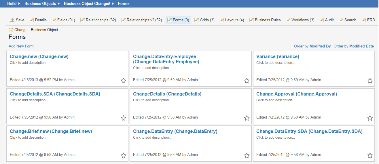3.Select the Forms tab. A list of forms for that business object appear. For example, the Change business object has the following forms: