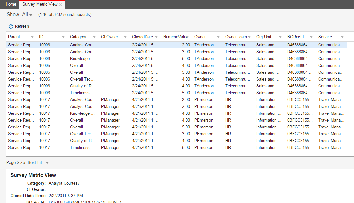 The SurveyMetricView business object has one form and one layout.  It is only available to administrators. The default form shows the following fields for each survey: