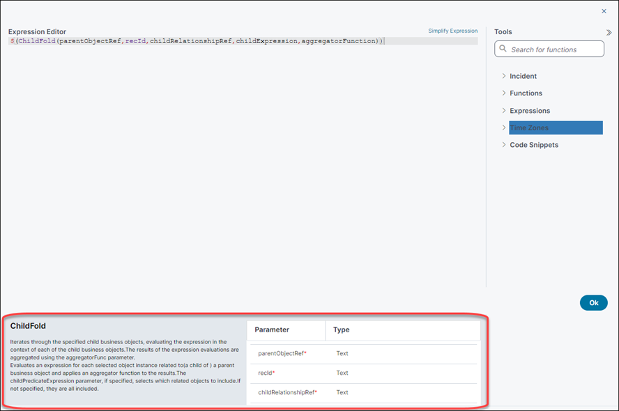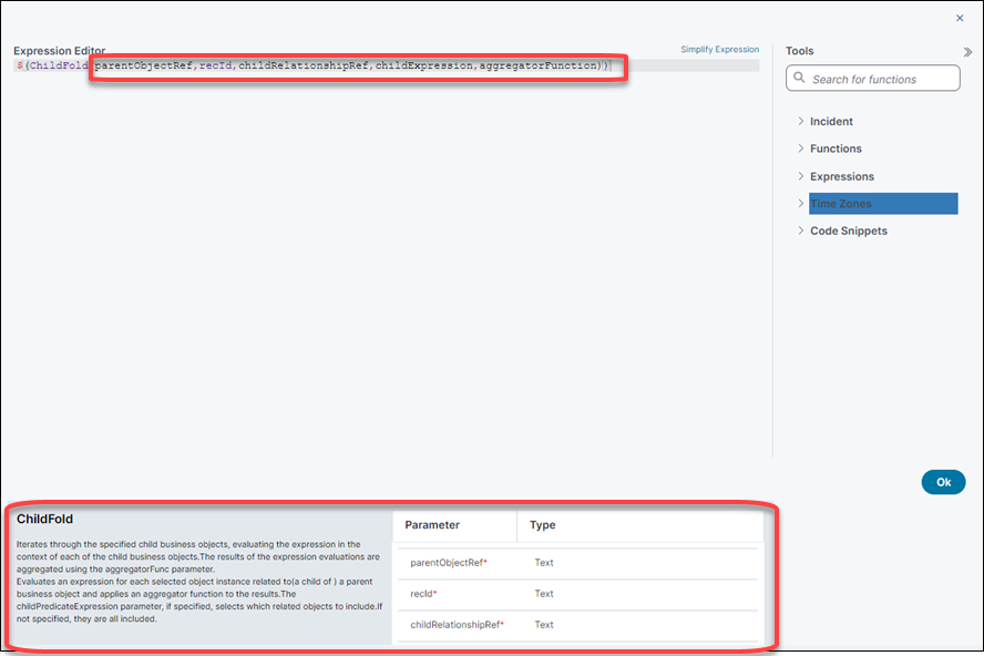 When you add a function to an expression, the mandatory parameter names are added to your expression automatically. For example, if you select the ChildFold function, the parameters parentObjectRef, recId, childRelationshipRef, childExpression, and aggregatorFunction are all added for you as per the image below.