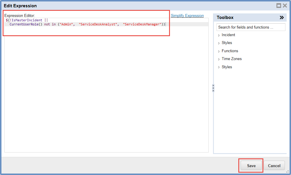 | c. | Enter $(!IsMasterIncident ||CurrentUserRole() not in ("Admin", "ServiceDeskAnalyst", "ServiceDeskManager")) and then click Save. |