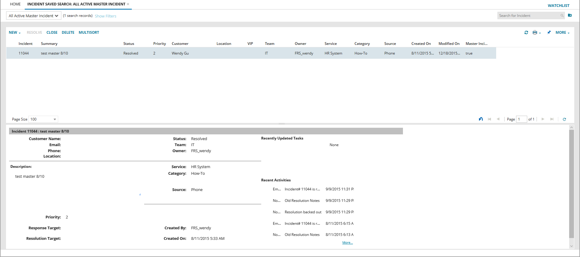 4.From the list of saved searches, click All Active Master Incident.