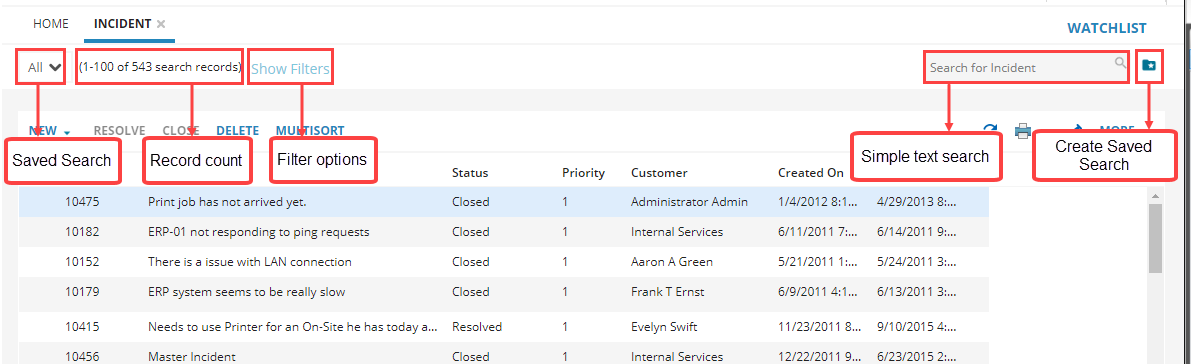 The search feature is available in most workspaces to help you easily find records. Advanced searches can include expressions to fine-tune your search criteria. You can create a saved search, keeping frequently used criteria handy, and even designate a saved search as a favorite.